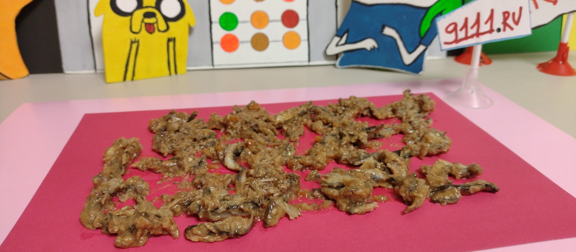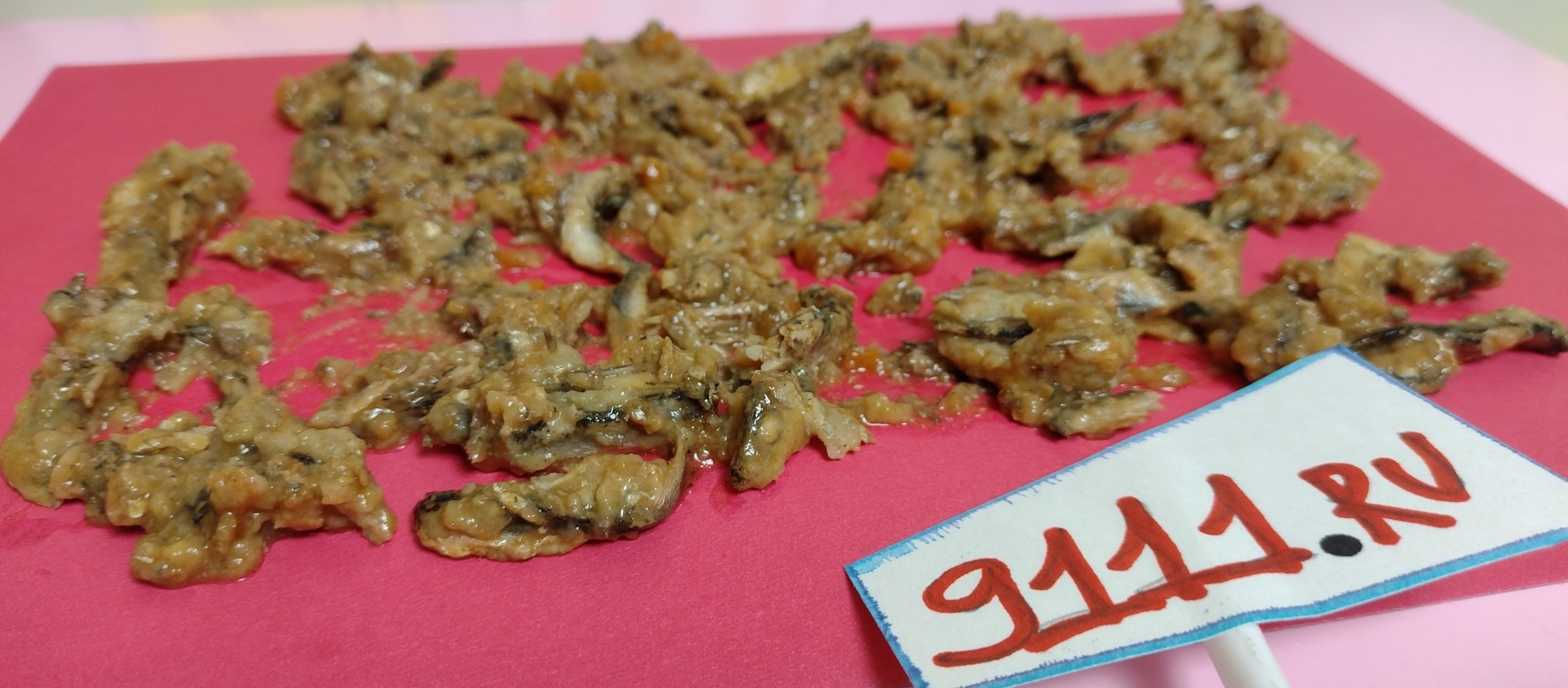 Ну а мы с вами продолжаем разделять и уже на этот раз, отделяем гущу от жижы. И видим, что вот это вот бесформенное месиво и есть наши рыбки, которые весят всего 127 грамм, а должны весить заявленные 156 грамм. Опять не сходится, это уже огромный минус.