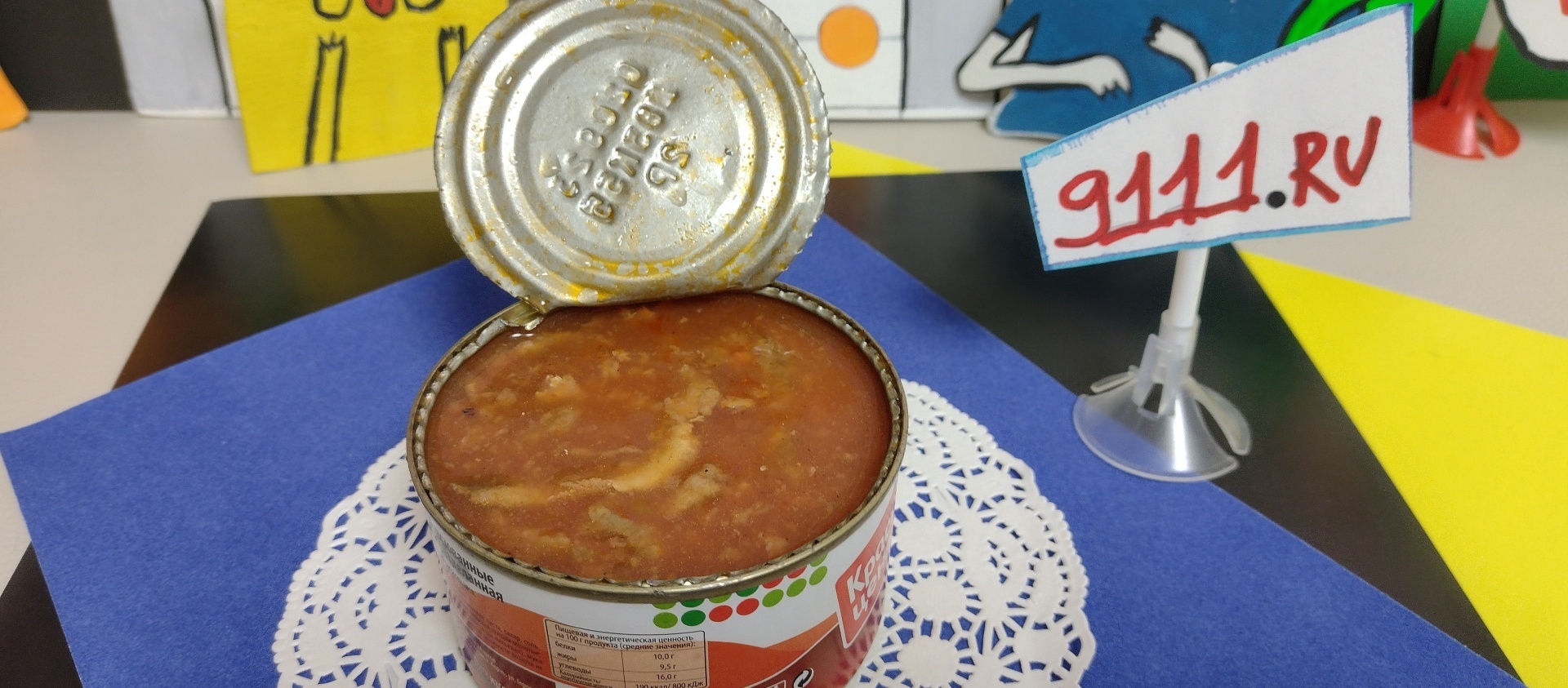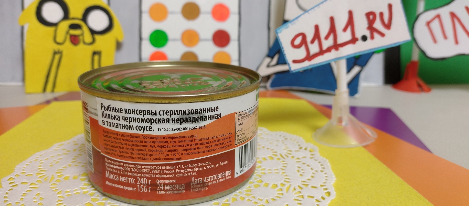 Если верить наклеенной этикетке, то внутри должны быть килька и томатный соус, никаких Е-добавок. Вот это поворот, меня это, честно, удивило. А производителем является "ВО СТО КРАТ" Крым!