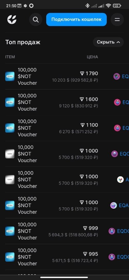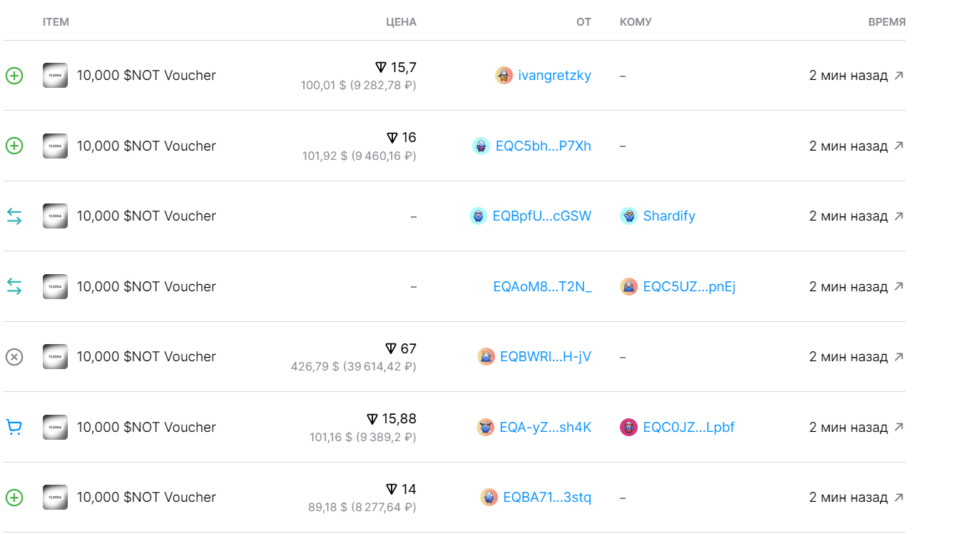 На втором фото, операции, которые производились в самом начале, когда появилась возможность менять монеты на ваучеры, с последующей их продажей. Блокчейн тем и хорош, что все операции прозрачны и их можно увидеть, в данном случае, вы можете посмотреть историю операций на сайте getgems.