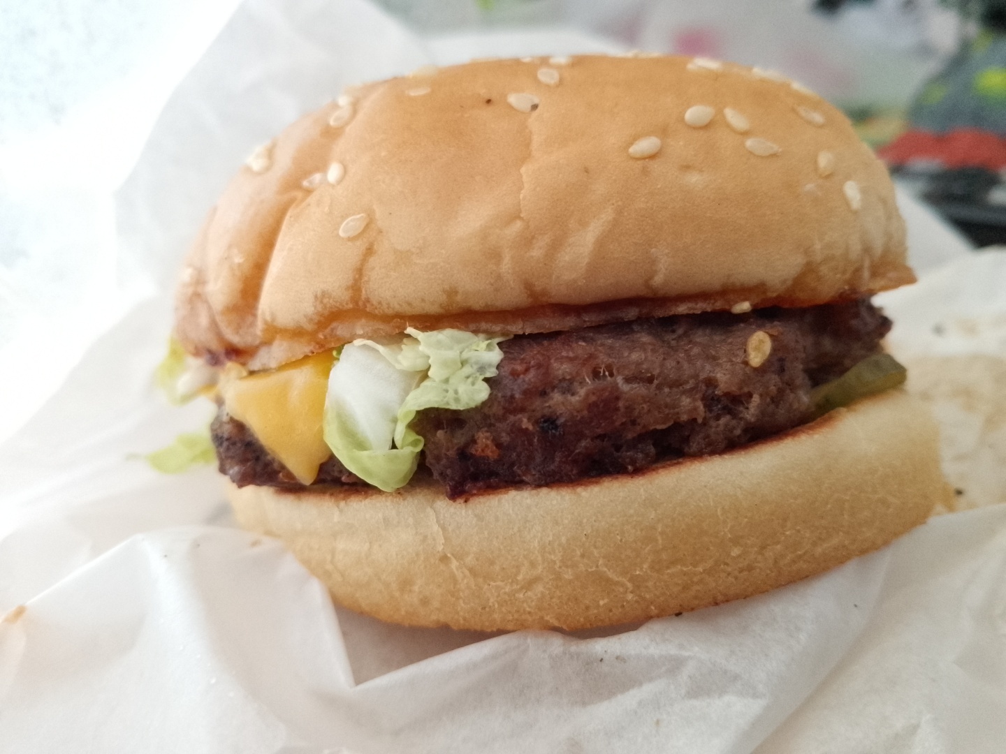 Маленькая булочка, но вкусная как с макдональдс, котлетка сочная, но тоже с не великим размерам. Ну и конечно лист салата, огурчик, сыр, соус - всё это вкусно, но немного.
