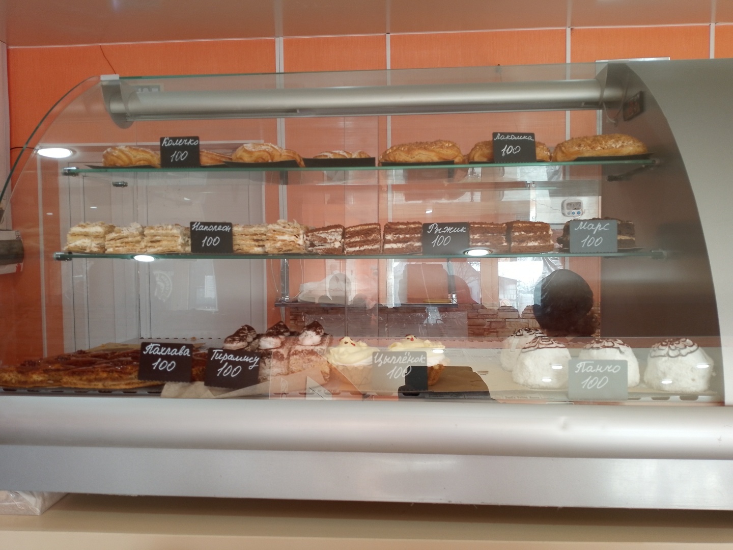 Ну как-же без сладенького? Конечно и такая, ветрина у них есть. Выбор хороший и цены не плохие, а если быть точнее, ценник одинаковый. Обсалютно все пирожные по 100р.