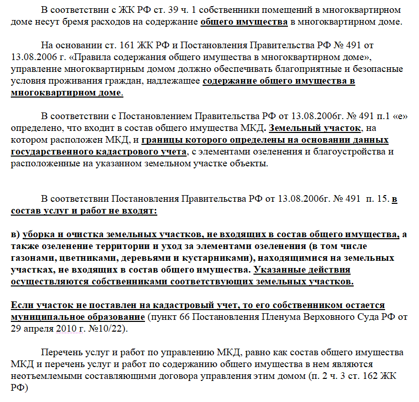 Если земельный участок не поставлен на кадастровый учет, то его собственником остается муниципальное образование . Значит за уборку придомовой территории несет ответственность ОМСУ. Собственники МКД платят только за содержание общего имущества дома. В договоре управления должно быть приложение, в котором прописан состав общего имущества дома.