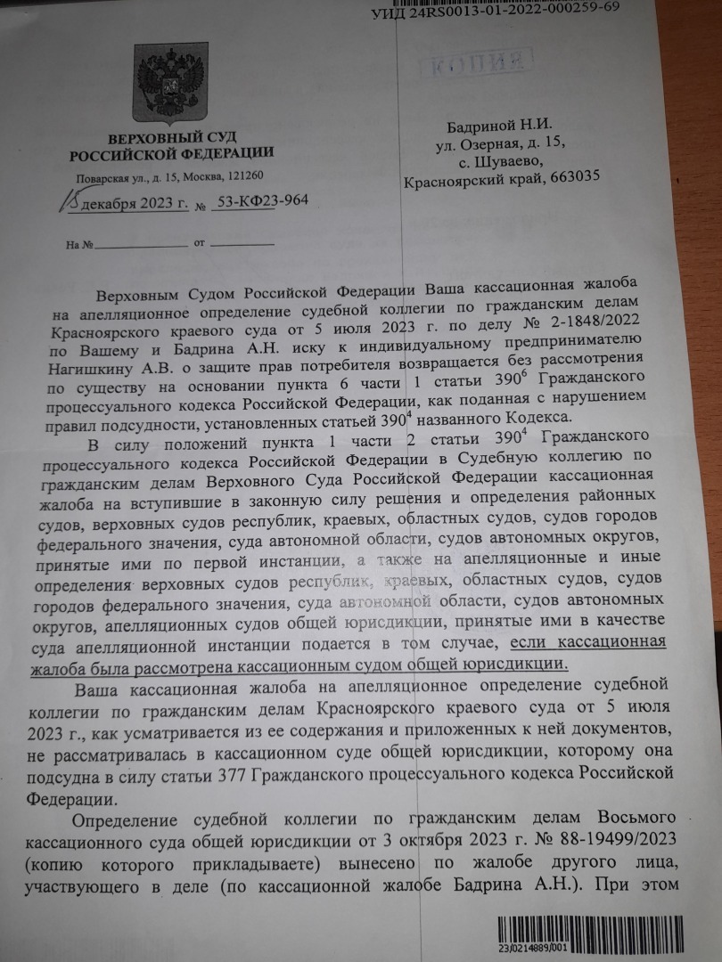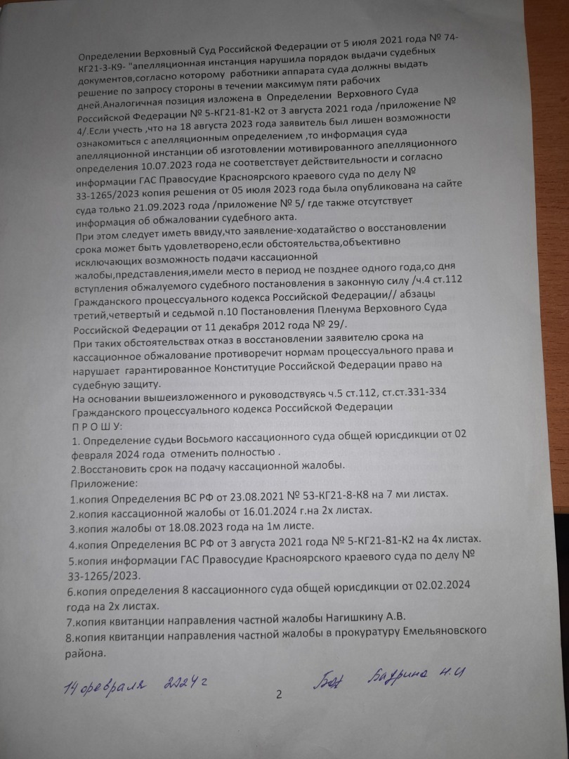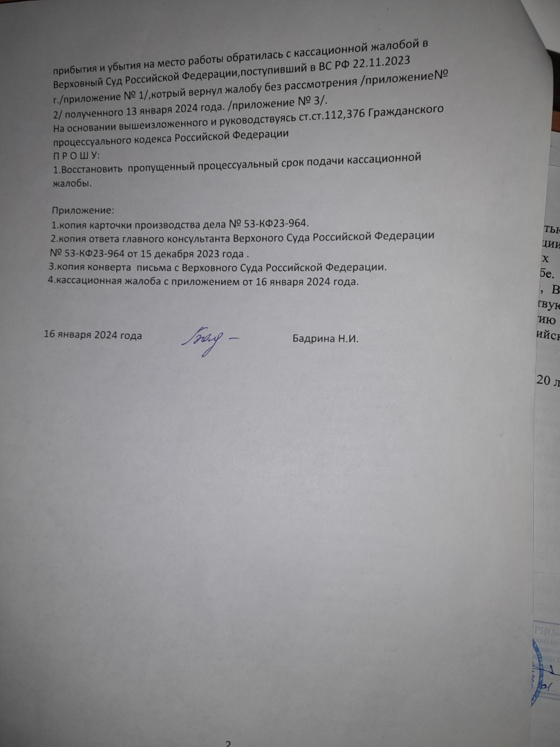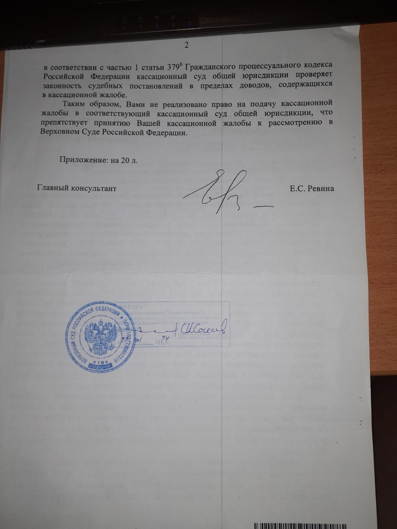 Кассационную жалобу ВС РФ подписала супруга .Получили вот такой ответ