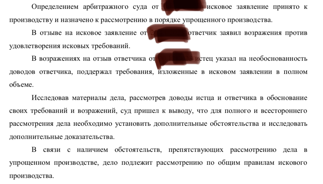 Заявление Истца было принято судом, по упрощенному производству. Написала возражения, (за ее подписью - ИП), а Истец (правобладатель) представил чуть позже возражения уже на наши возражения. Суд в январе 2024 года перешел из упрощенного производства в общее исковое.