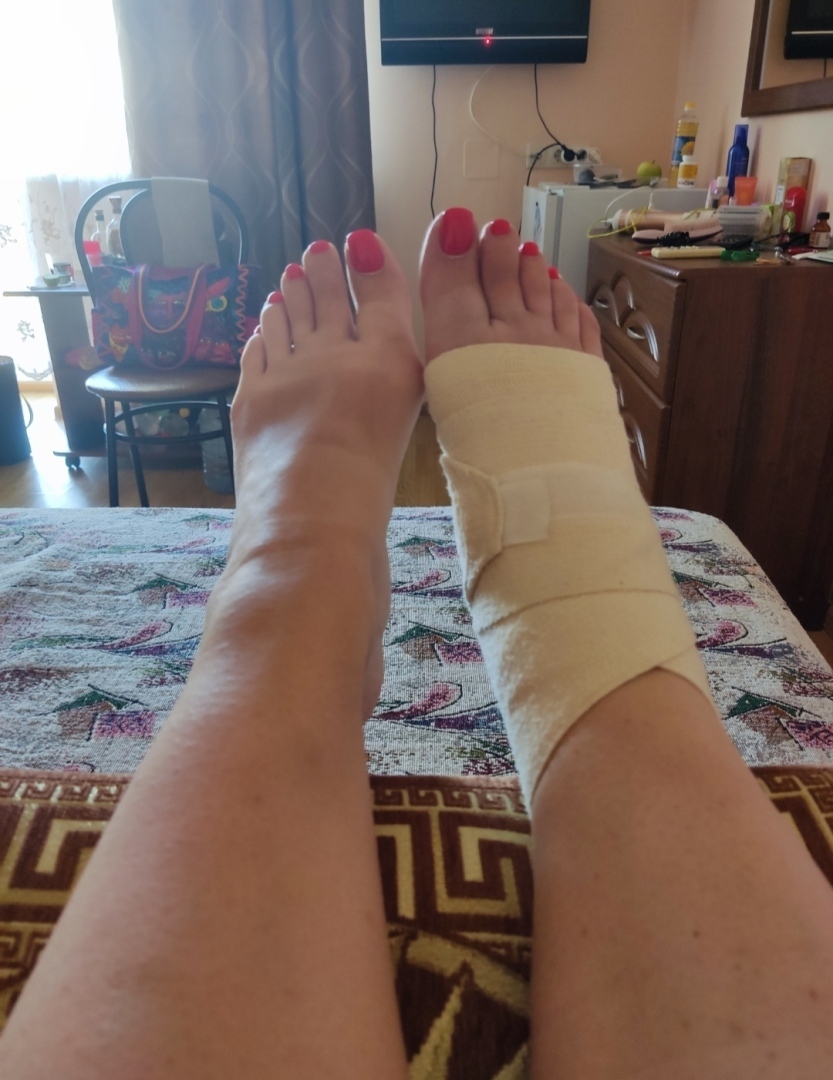 Приезжала вечером в номер, перематывала ногу эластичным бинтом и подушку ещё под ноги подкладывала. Когда больная нога лежала на плоской поверхности было некомфортно.