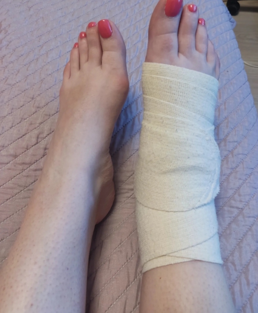Дома я намазала больную ногу кремом диклофенак и наперемотала эластичным бинтом, потому что просто не знала, что с ней ещё можно было сделать.
