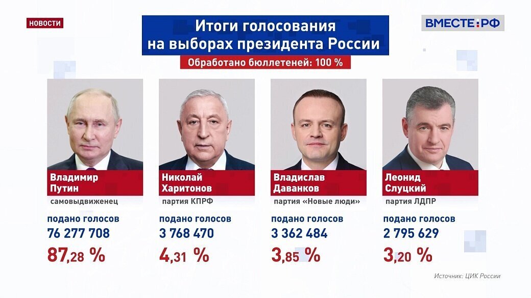 Вчера ЦИК обнародовала окончательные официальные результаты выборов президента. Памфилова подписала итоговый протокол. Результат впечатляет.