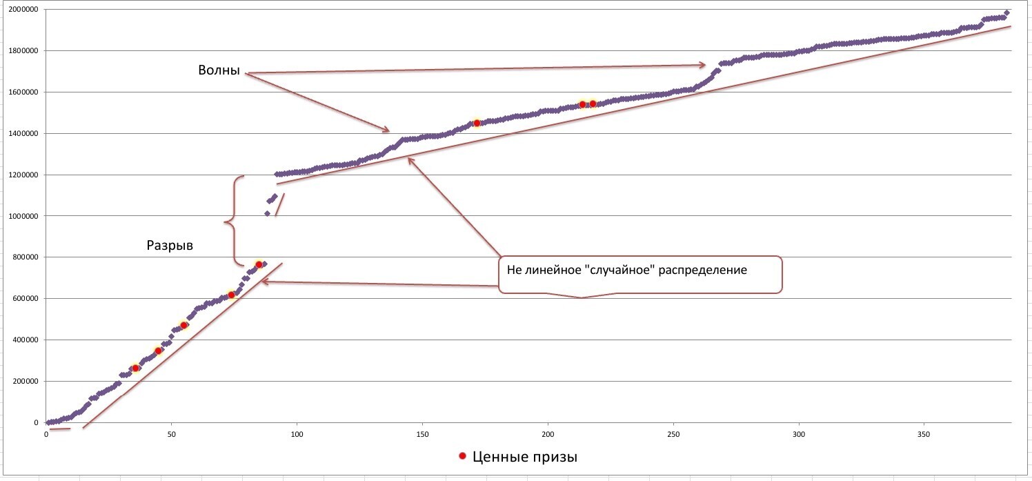 Обычно при розыгрыше подарков используется генератор случайных чисел. В таком случае подарки распределяются равномерно по всему диапазону. На мой взгляд, должна быть примерно прямая линия на всём протяжении выборки, а это 2 миллиона билетов.
