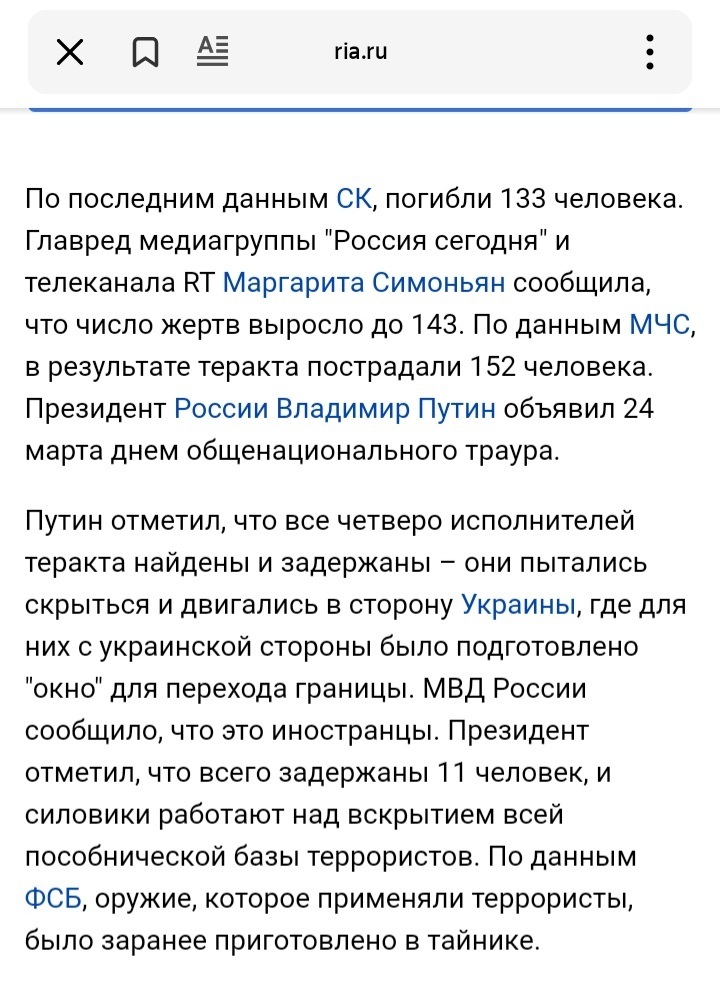 "По последним данным СК, погибли 133 человека. Главред медиагруппы "Россия сегодня" и телеканала RT Маргарита Симоньян сообщила, что число жертв выросло до 143. По данным МЧС, в результате теракта пострадали 152 человека. Президент России Владимир Путин объявил 24 марта днем общенационального траура."