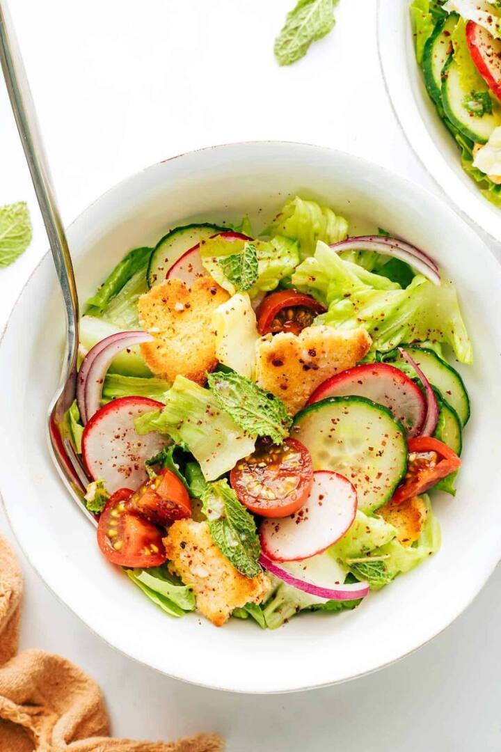 2. Приготовьте салат: в большой миске смешайте капусту, огурец, красный лук, помидоры, редис, мяту и половину гренок. Равномерно полейте заправкой и перемешайте.