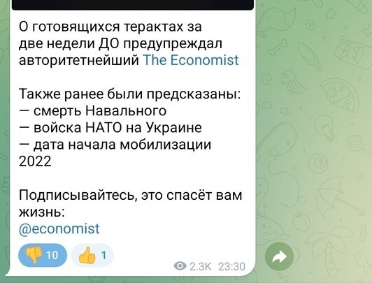 А теперь весь «Телеграм» забит рекламой про террористов с «Крокуса». Вы что, с ума посходили? Ладно, «рекламодатели» — они мать готовы родную за деньги продать. Но вы, авторы каналов, известные военные корреспонденты, политики и обозреватели, жалкие лицемеры. Вы можете хоть тысячи раз оправдывать это, но никто никогда не поверит, что в момент трагедии в стране вы могли бы просто отключить рекламу на неделю. Ничего, без трусов бы не остались. Вы говорите о патриотизме, о помощи, любви, доблести, чести, верности, а сами не удосуживаетесь лично или вбить своему админу в голову, чтобы тот не публиковал подобного рода рекламу. Почти вся реклама, публикуемая вами, это фейки, провокации — откровенная ложь и игра на сочувствующих гражданах.