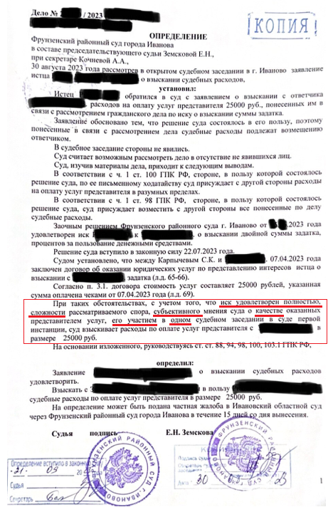 Так, в приложенном Определении Фрунзенский районный суд г. Иваново удовлетворил заявление моего Доверителя о взыскании судебных расходов в полном объеме.