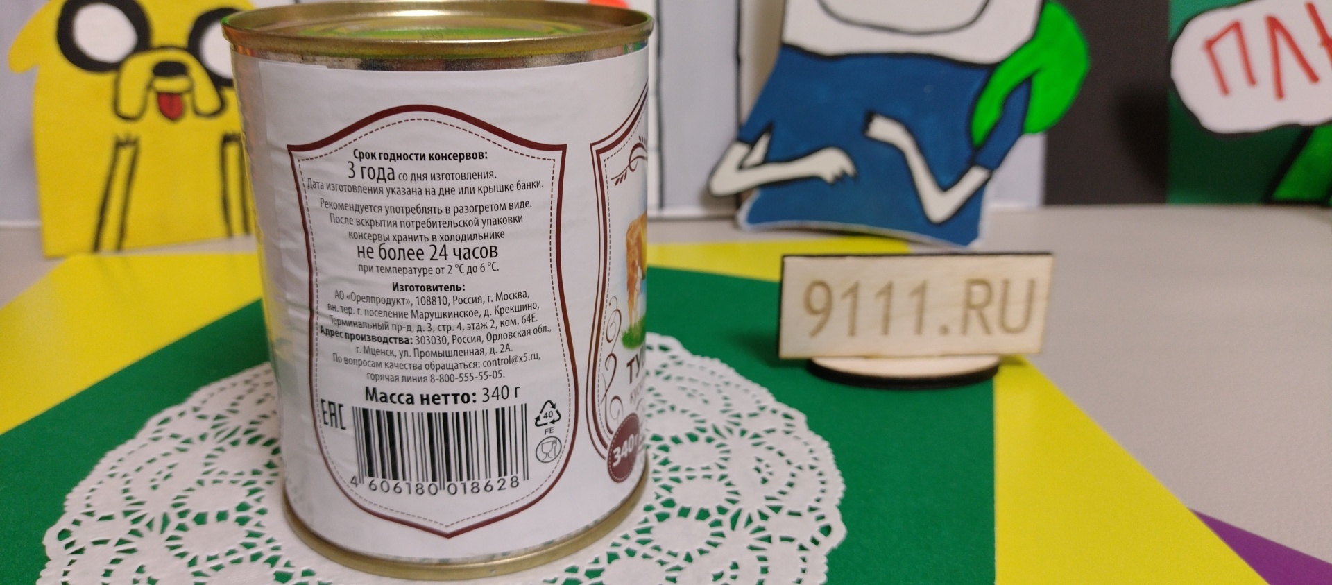 А вот по срокам всё в порядке, он составляет аж целых 3 года, и произведена наша "тушенка" в России в Орловской области в городе Мценске АО "Орелпродукт".