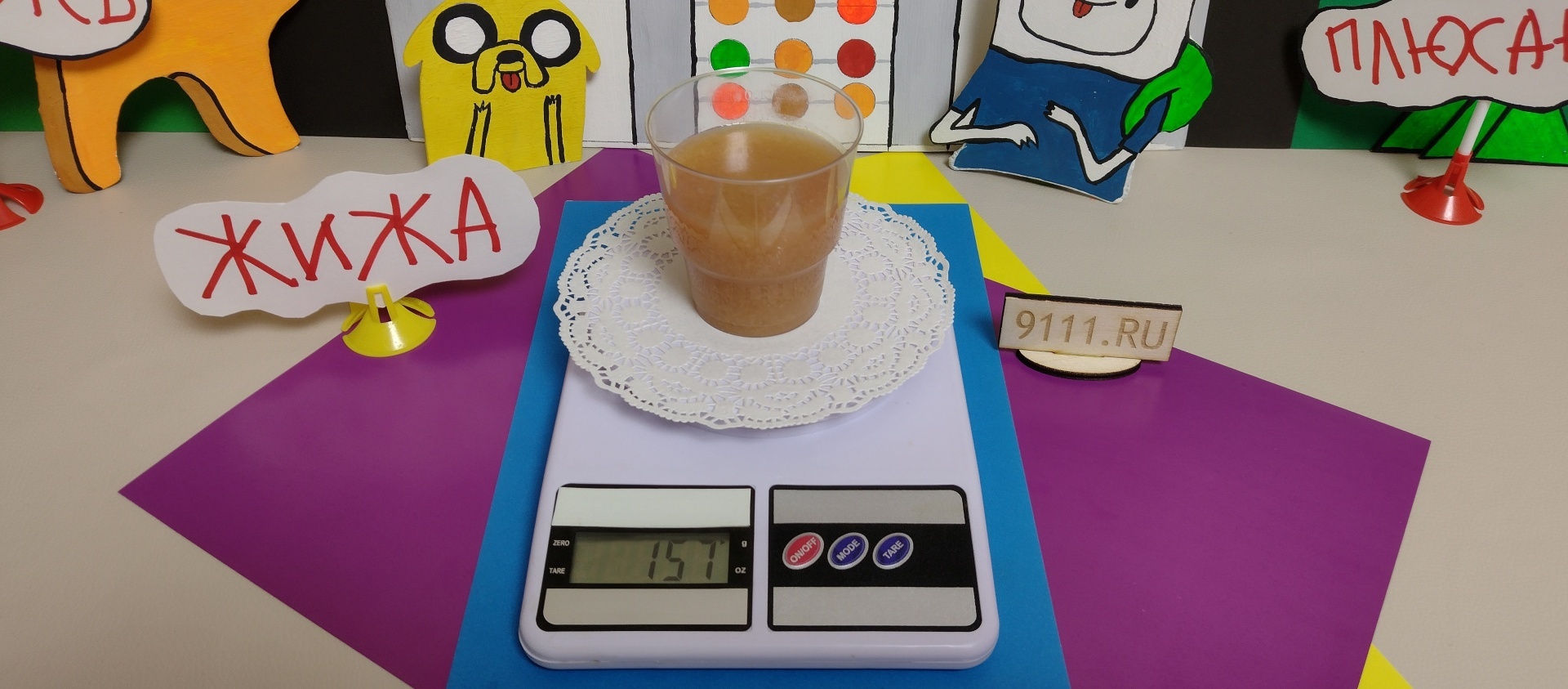 Разделяем нашу субстанцию на части и для начала взвесим жижу, в которой всё это плавало. Весит она целых 157 граммов – это почти половина от общего веса продукта.