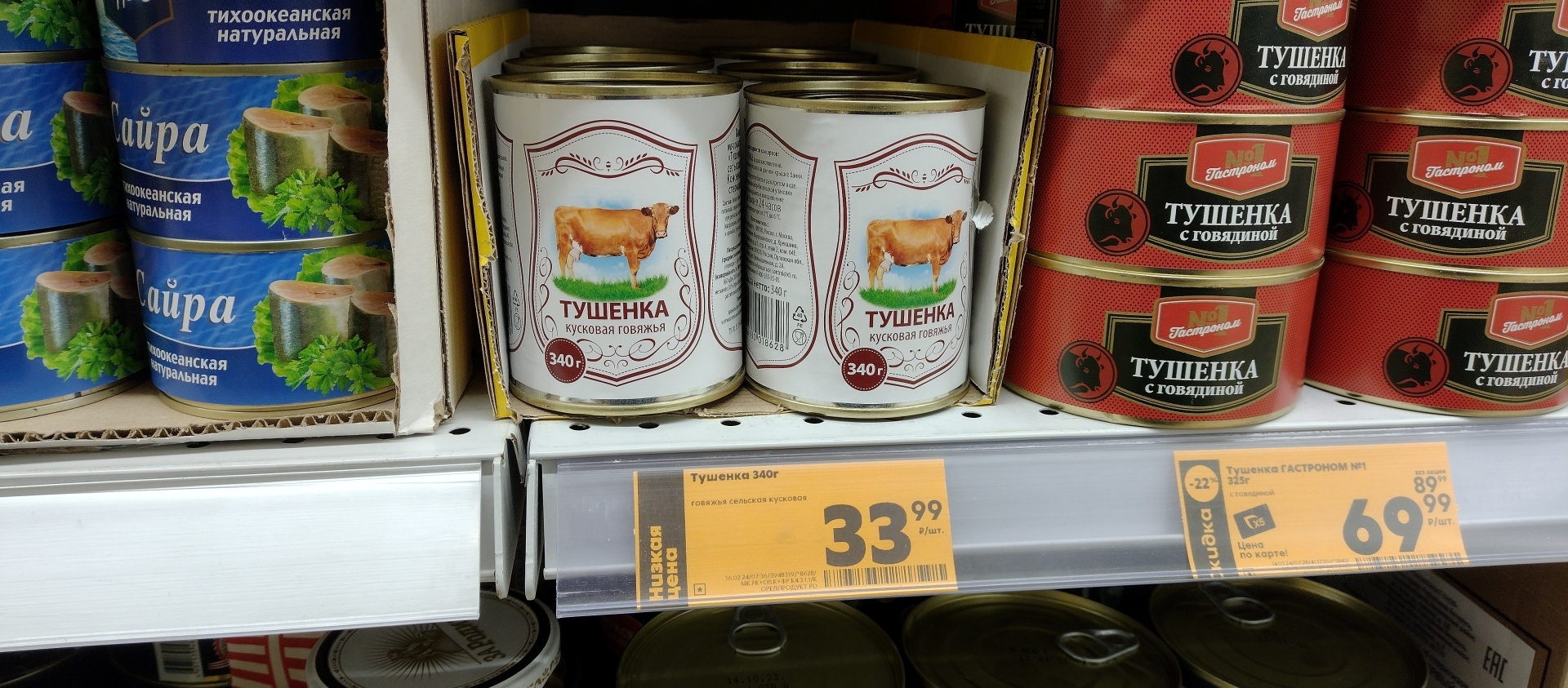 Сомневаюсь что сейчас вы и за 200 рублей купите НОРМАЛЬНУЮ тушенку! Как-то купил за 250 рублей (не в Пятерочке) говяжью тушенку. Захотелось вспомнить молодость - сделать картофельное пюре с тушенкой. В армии кормили. Но открыв банку понял, что затея НЕ УДАЛАСЬ! В массе, очень напоминающей расплавленный парафин плавали куски чего-то отдаленно напоминающего мясо. Получше выглядело, чем у автора в тушенке за 33 рубля, НО ЕСТЬ ЭТО ТОЖЕ НЕ ХОТЕЛОСЬ! А запах (специфический) этой "тушенки" даже отдаленно не напоминал запах армейской! К сожалению, не додумался сфотографировать этот продукт и производителя не запомнил. Выбрасывать не стал, вынес во двор, там живут две дворняги, которых жители подкармливают. Предложил им. Они вдвоем подошли, понюхали, с сомнением посмотрели на меня. Вроде как спросили, и чего ты нам принес? Попробовали, НО ЕСТЬ НЕ СТАЛИ!