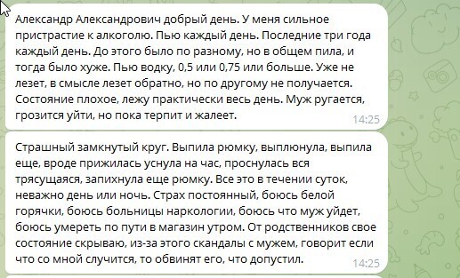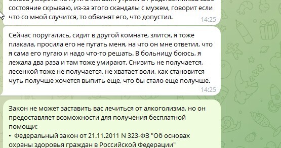 Сейчас поругались, сидит в другой комнате, злится, я тоже плакала, просила его не пугать меня, на что он мне ответил, что я сама его пугаю и надо что-то решать. В больницу боюсь, я лежала два раза, и там тоже умирают. Снизить не получается, лесенкой тоже не получается, не хватает воли, как становится чуть получше – хочется выпить еще, чтобы стало еще лучше.