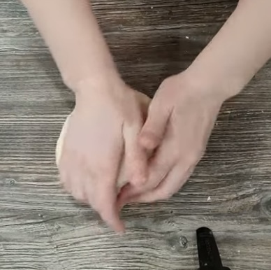 Тесто можно растянуть руками, можно произвести раскатку скалкой