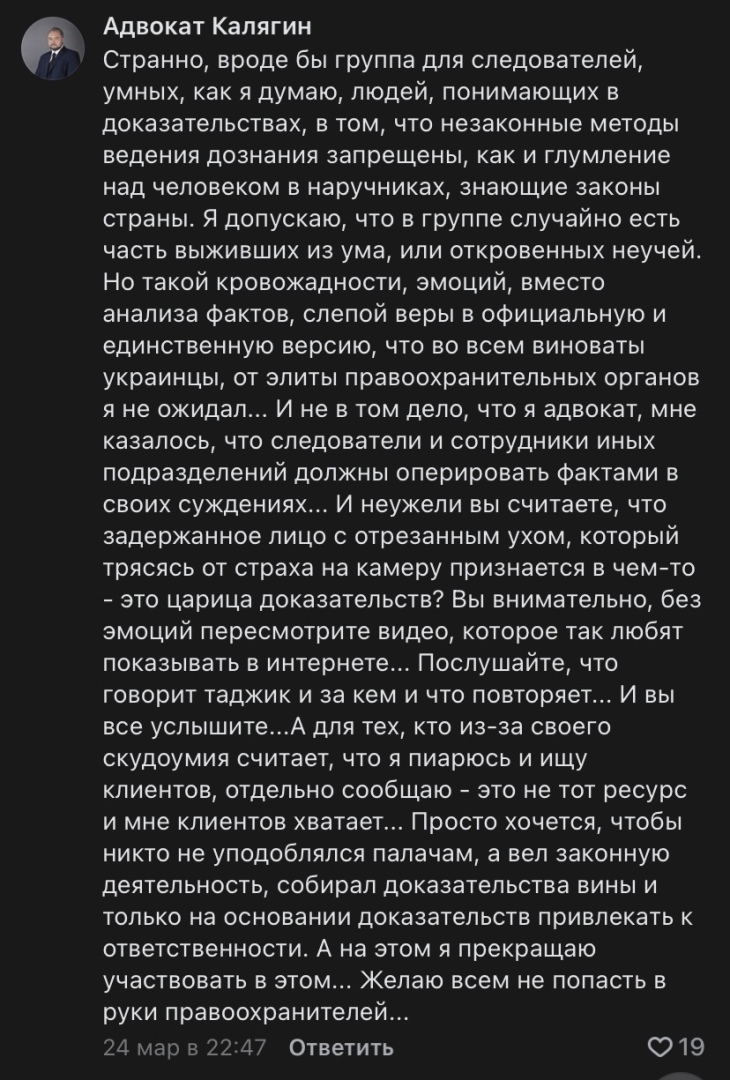 На фоне произошедшего в Подмосковье теракта появляются люди, защищающие задержанных подозреваемых, считая их невиновными и осуждая методы сотрудников силовых структур в отношении этих лиц.