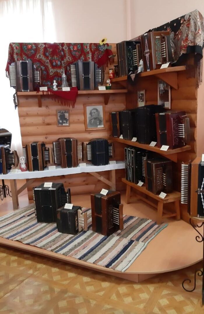 В музее коллекция гармошек