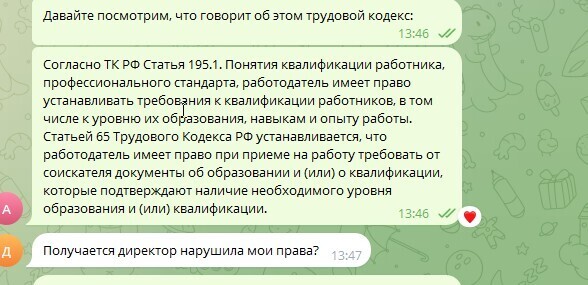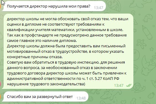 Таким образом, директор школы не могла обосновать свой отказ тем, что ваши оценки в дипломе не соответствуют требованиям к квалификации учителя математики, установленным в школе. Так как в профстандарте не предусмотрено данное требование, самое главное – это наличие диплома.