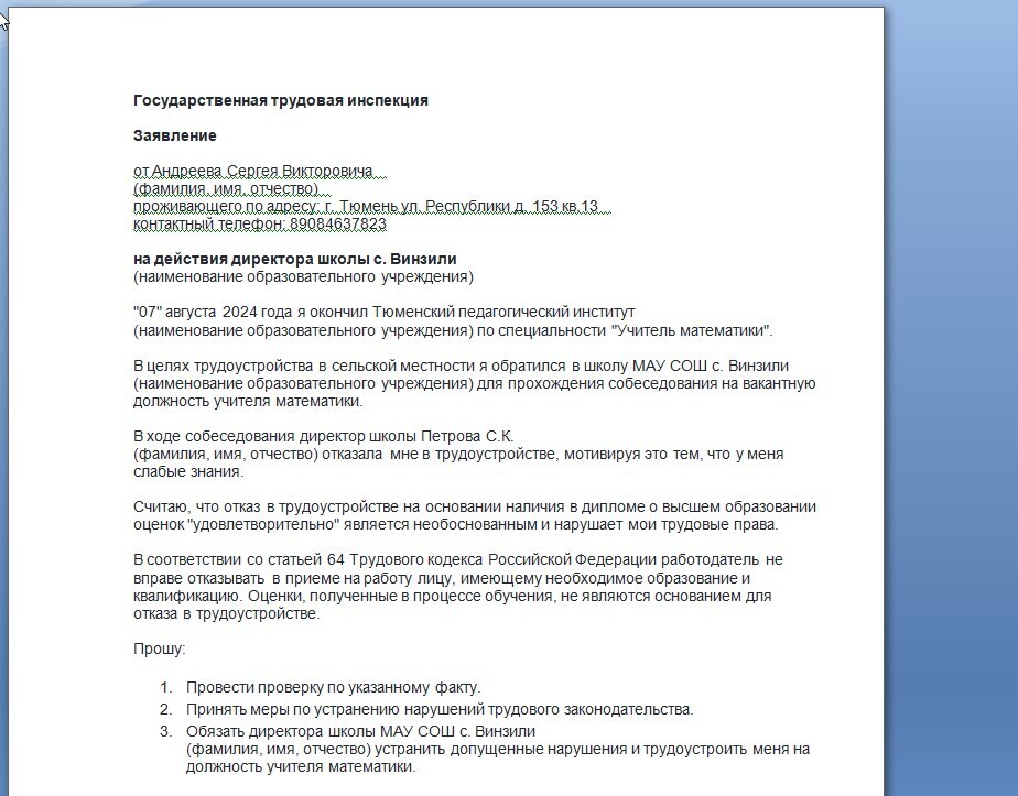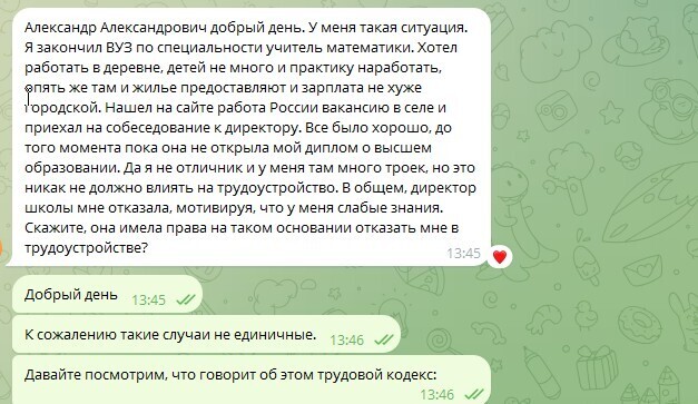 "Александр Александрович, добрый день. У меня такая ситуация: я закончил вуз по специальности "учитель математики". Хотел работать в деревне, детей немного и практику наработать, опять же там и жилье предоставляют и зарплата не хуже городской. Нашел на сайте "Работа России" вакансию в селе и приехал на собеседование к директору. Все было хорошо, до того момента, пока она не открыла мой диплом о высшем образовании. Да я не отличник, и у меня там много троек, но это никак не должно влиять на трудоустройство. В общем, директор школы мне отказала, мотивируя тем, что у меня слабые знания. Скажите, она имела права на таком основании отказать мне в трудоустройстве?"
