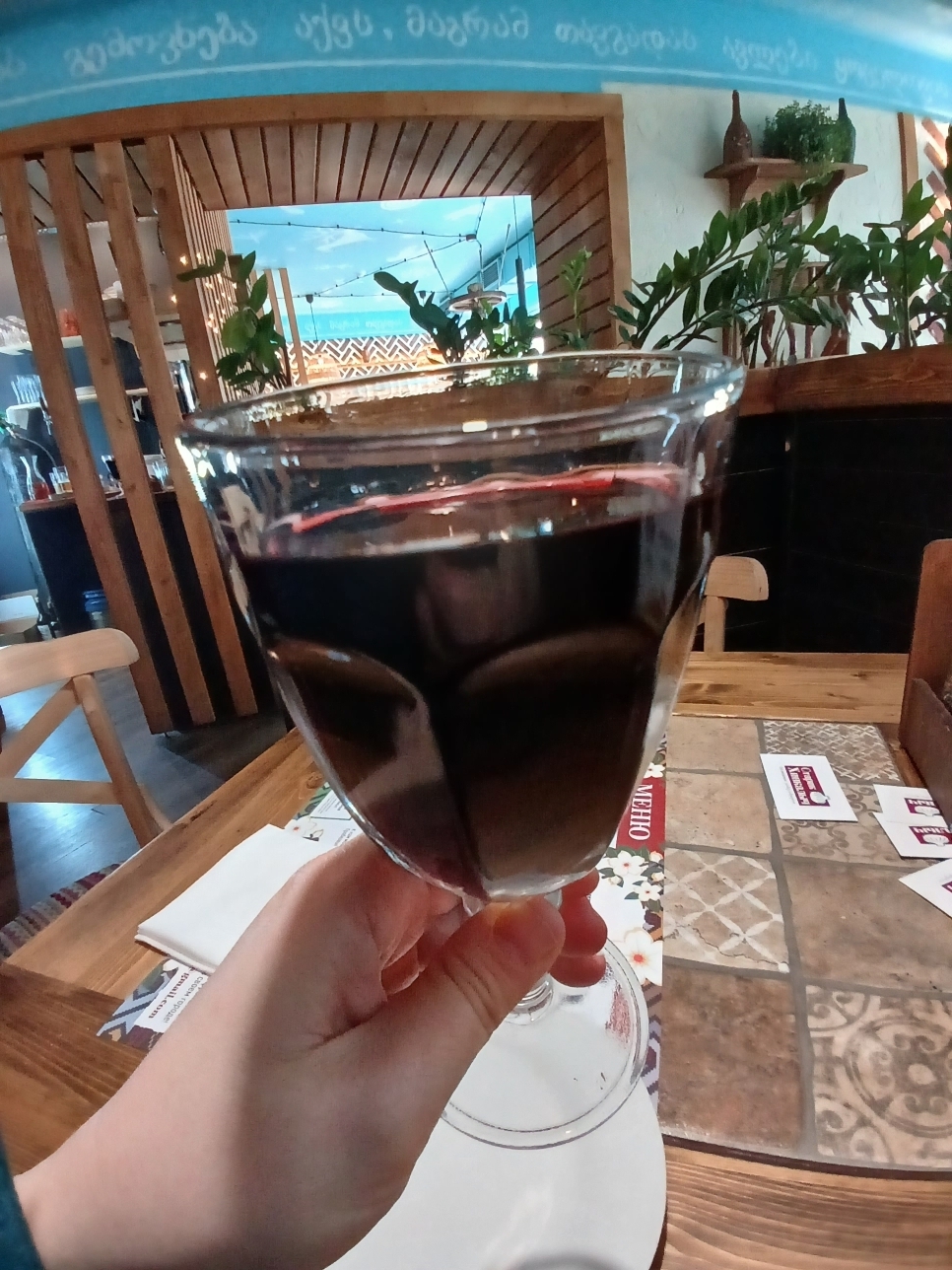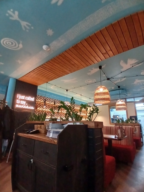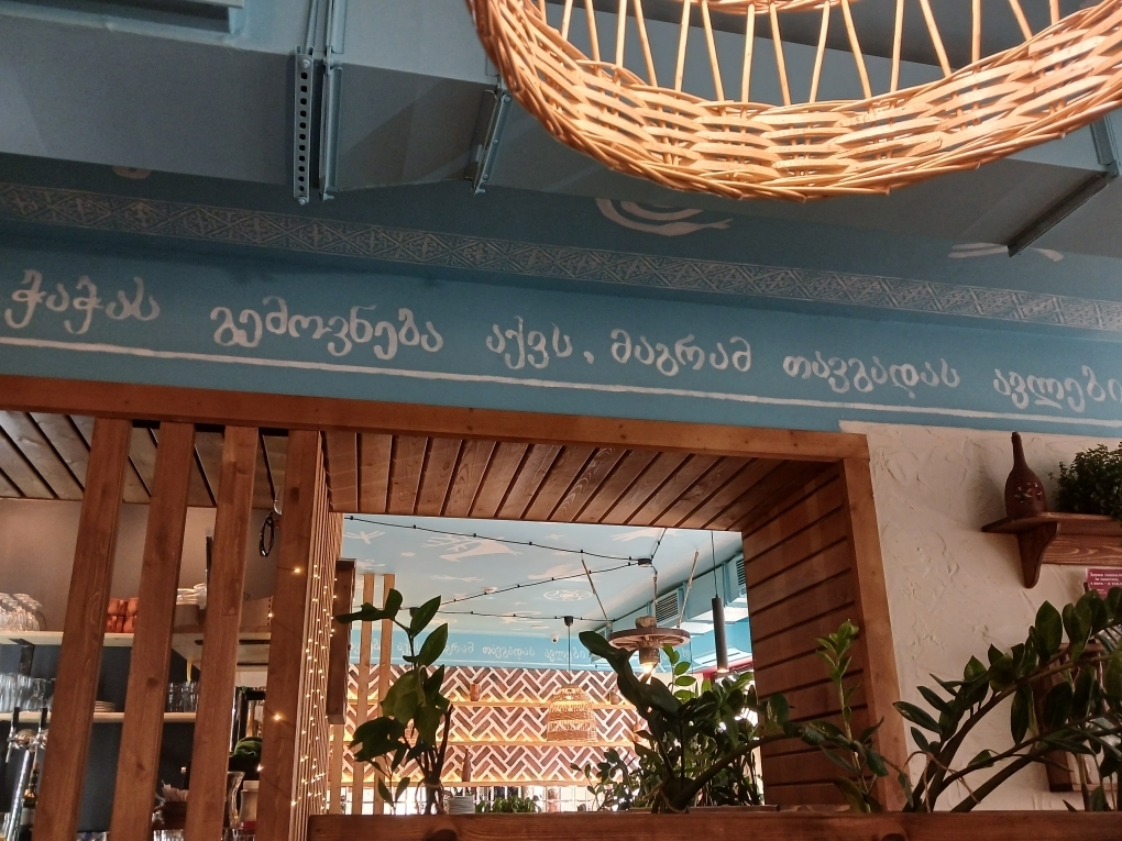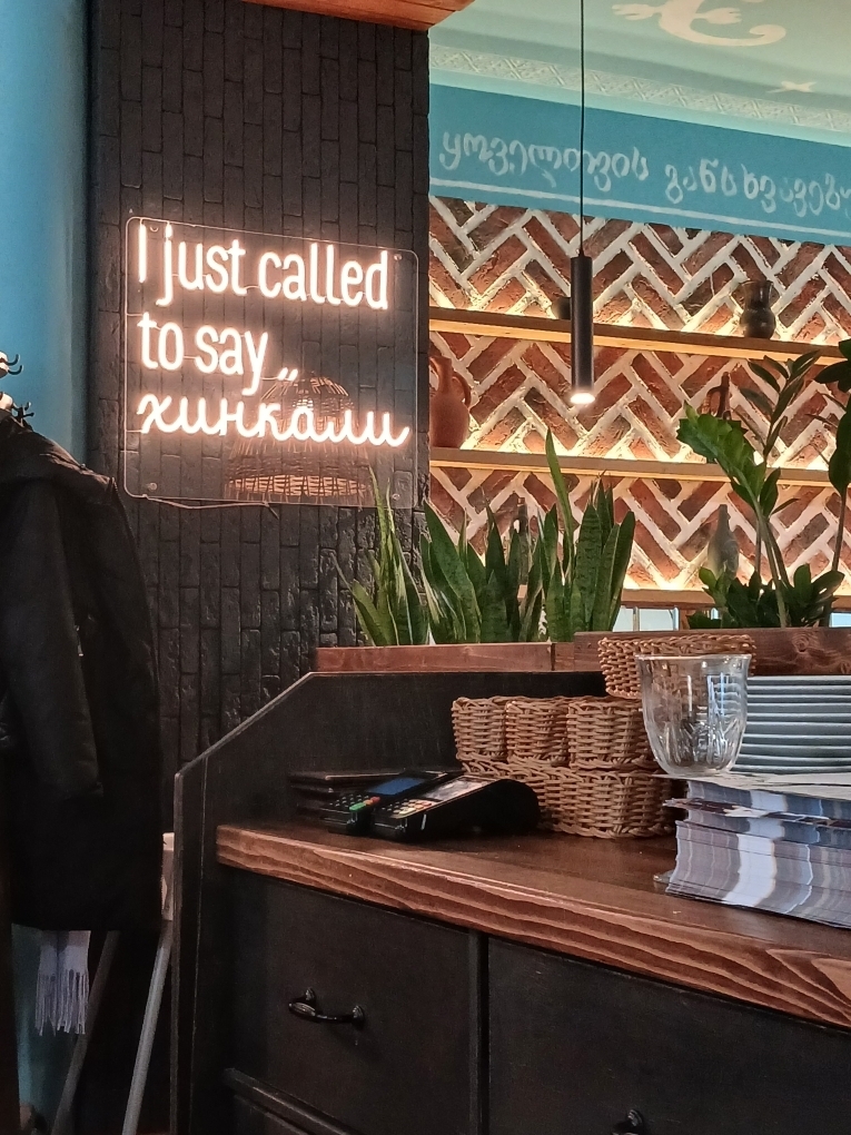 Уютно и современно. В зале тепло, звучит грузинская музыка. Днем в выходной день были свободные столики, села спокойно.