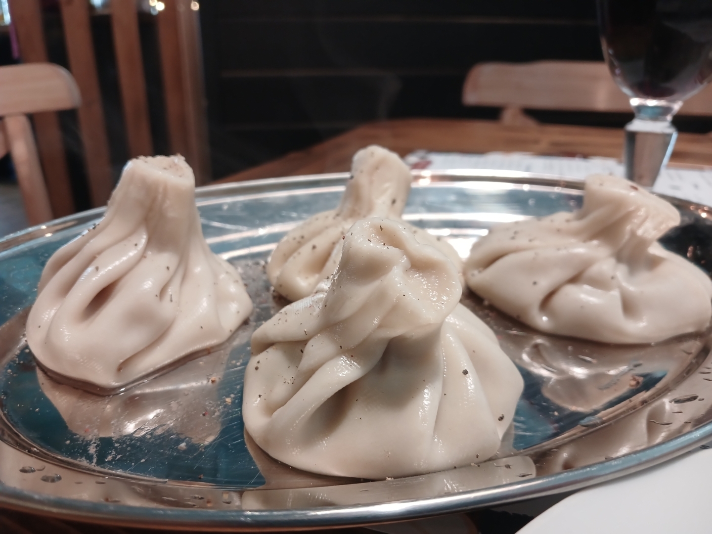 Взяла хинкали с мясом и зеленью, с сыром, с грибами и картофелем.