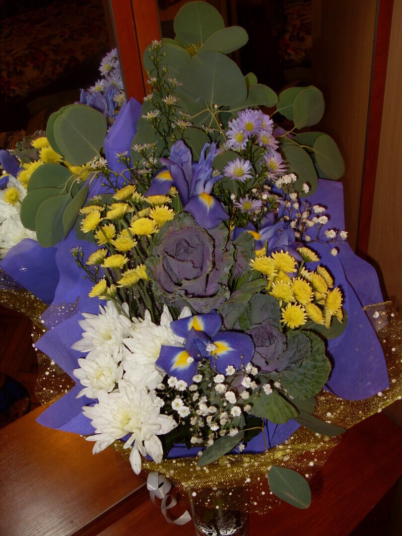 Очень даже понравились Ваши идеи. Выбираю «Букет радости» — из желтых гербер и роз с добавлением сезонных цветов с зеленым декором.