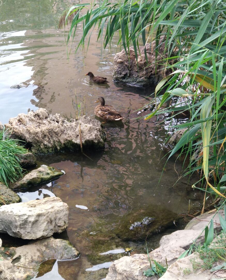 Спускаемся вниз. Там небольшая, неглубокая купель и родник. Плавают уточки, сидят на лавочке люди. Мы умылись, набрали воды и пошли домой вдоль речки Темерник.