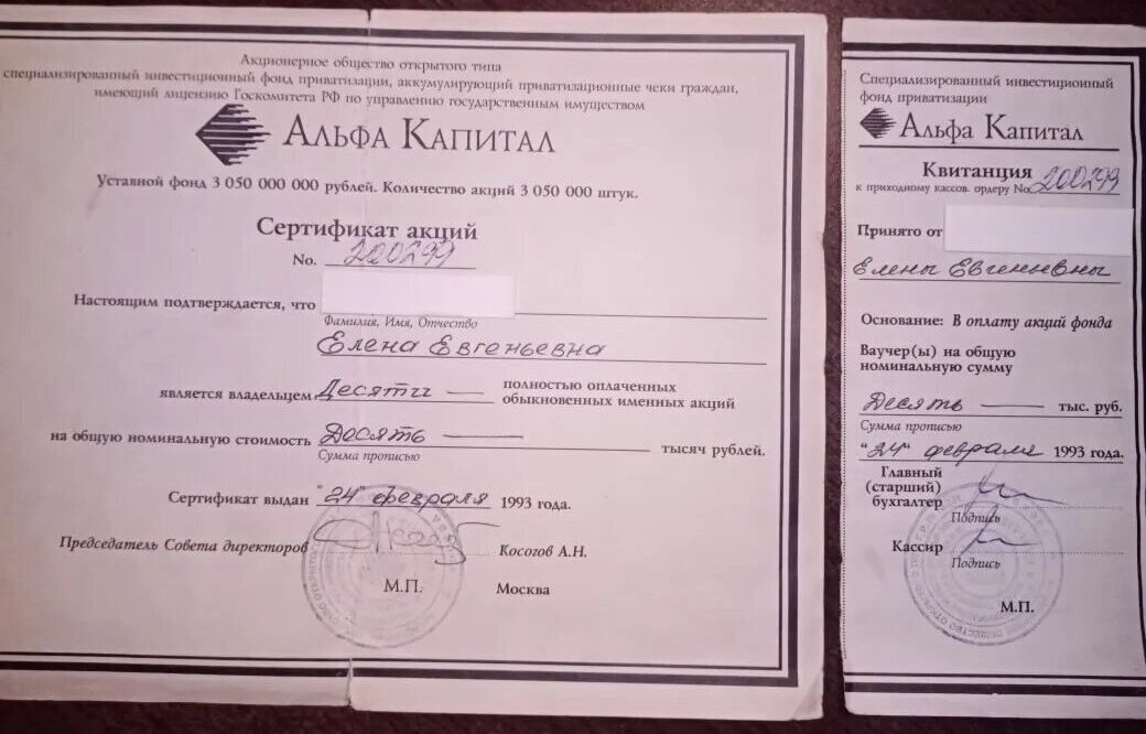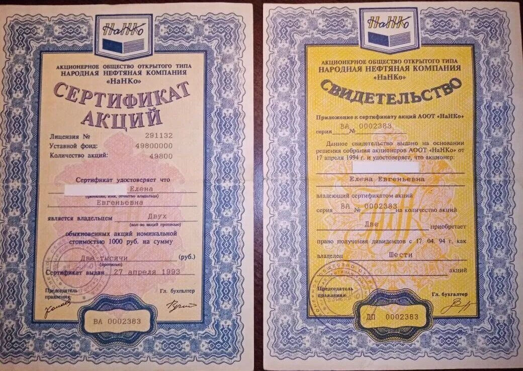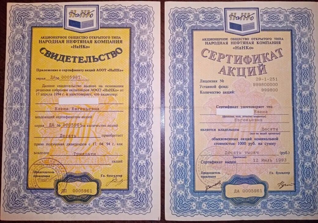 Нашла дома сертификаты акций "Альфа Капитал" и нефтяной компании "НаНКо" за 1993 год, приобретённые за ваучеры. Только вот что с ними делать, не знаю