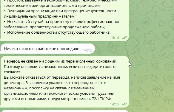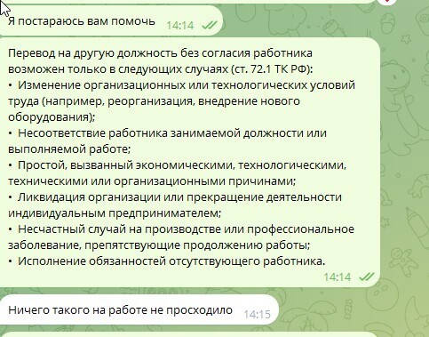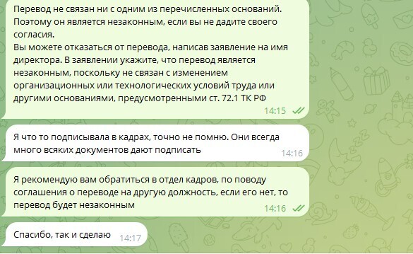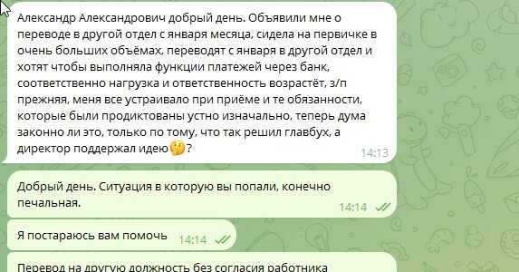 Александр Александрович добрый день. Объявили мне о переводе в другой отдел с января месяца, сидела на первичке в очень больших объёмах, переводят с января в другой отдел и хотят чтобы выполняла функции платежей через банк, соответственно нагрузка и ответственность возрастёт, з/п прежняя, меня все устраивало при приёме и те обязанности, которые были продиктованы устно изначально, теперь дума законно ли это, только по тому, что так решил главбух, а директор поддержал идею🤔?