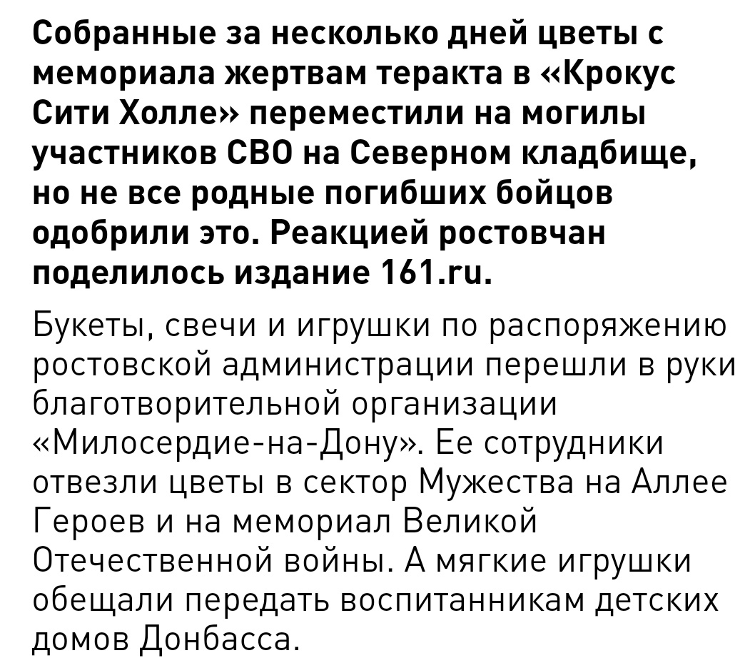 Как обычно тема публикации навеяна комментариями в обсуждениях. А именно возмущениями некоторых граждан по поводу того, что цветы с временного мемориала в Ростове отправили на на могилы участников СВО, а мягкие игрушки планируют передать в детский дом.