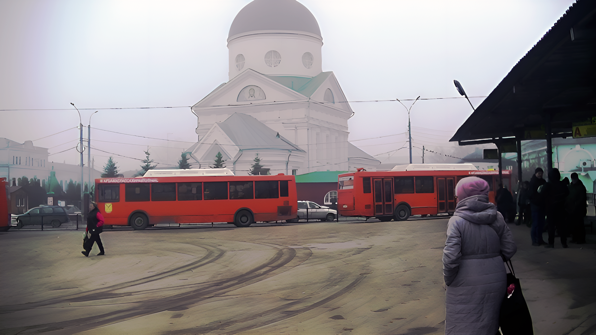 Как только наш рейсовый автобус подошел к автовокзалу и мы сразу же увидели перед собой в густой дымке поразительной красоты церковь. Чтобы заснять ее в разных ракурсах нам потребовалось устроить перерыв для того, чтобы наступила ясная, солнечная погода.