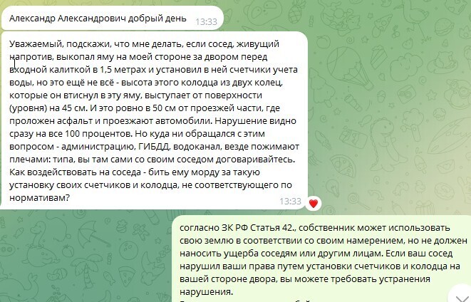 "Уважаемый, подскажи, что мне делать, если сосед, живущий напротив, выкопал яму на моей стороне за двором перед входной калиткой в 1,5 метрах и установил в ней счетчики учета воды, но это ещё не всё – высота этого колодца из двух колец, которые он втиснул в эту яму, выступает от поверхности (уровня) на 45 см. И это ровно в 50 см от проезжей части, где проложен асфальт и проезжают автомобили. Нарушение видно сразу на все 100 процентов. Но куда ни обращался с этим вопросом: администрацию, ГИБДД, Водоканал, везде пожимают плечами: типа, вы там сами со своим соседом договаривайтесь. Как воздействовать на соседа: бить ему морду за такую установку своих счетчиков и колодца, не соответствующего по нормативам?"
