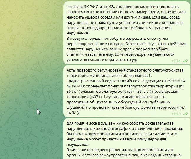 Согласно ЗК РФ, ст. 42, собственник может использовать свою землю в соответствии со своим намерением, но не должен наносить ущерба соседям или другим лицам. Если ваш сосед нарушил ваши права путем установки счетчиков и колодца на вашей стороне двора, вы можете требовать устранения нарушения.