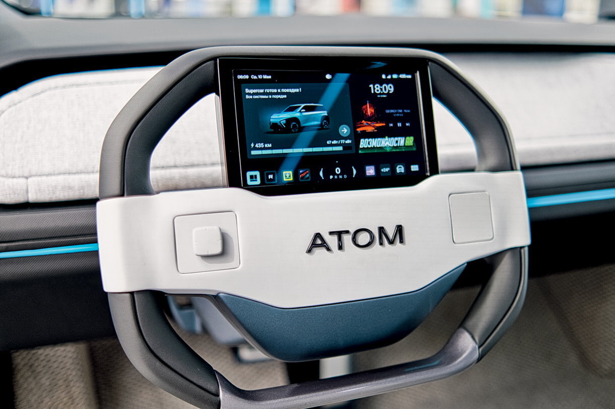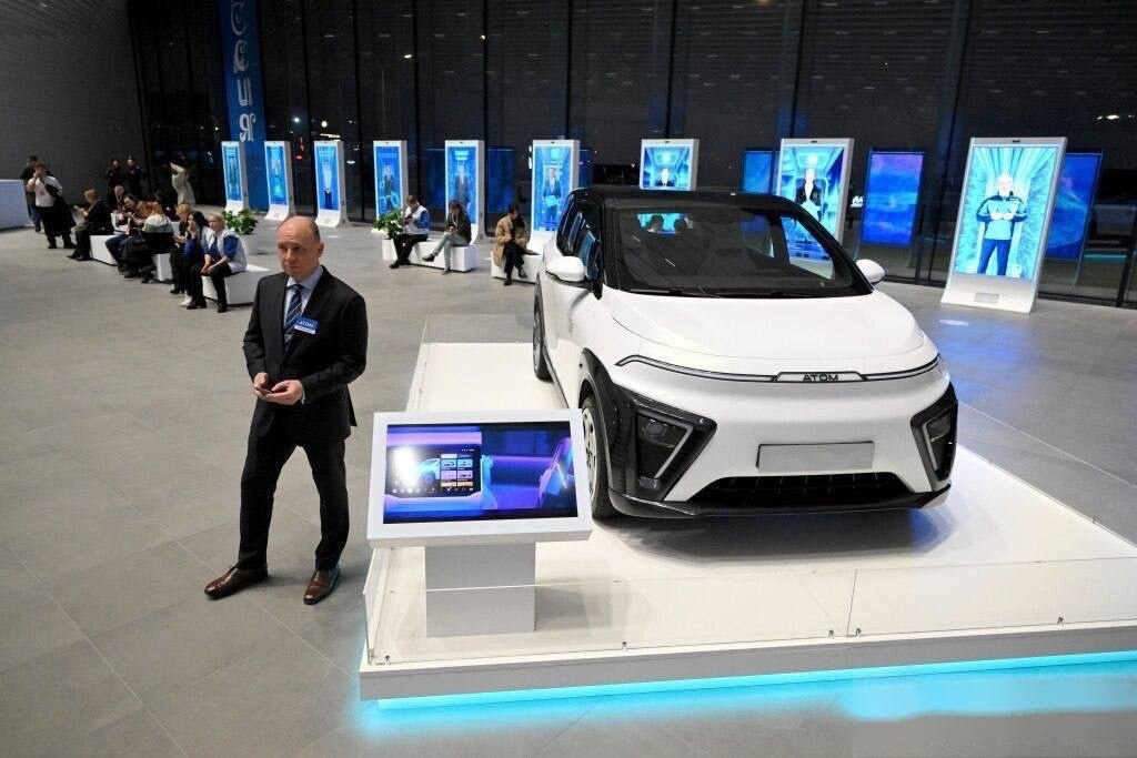 Войдя в павильон нас встретил образец новейшего электромобиля, его название "Атом". Экскурсовод объявил, что на "Атом" постоянно идут заказы. Что подчеркивало колоссальность нового образца!