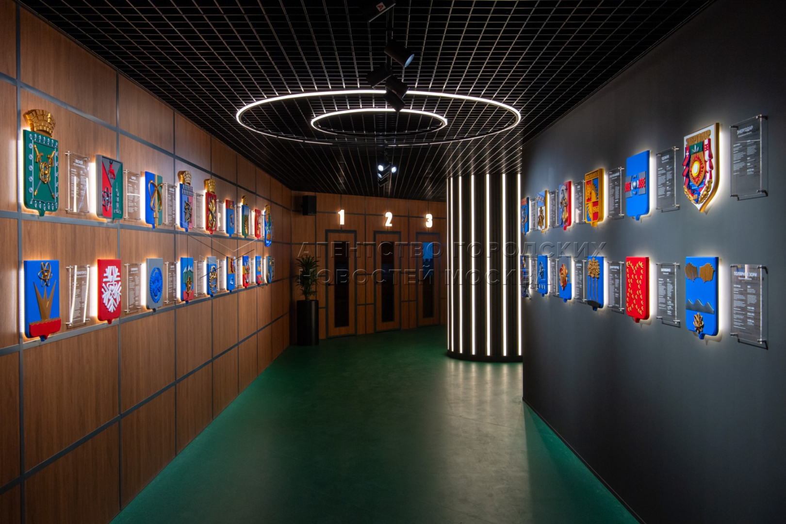 Экспозиция "Росатом". Здесь экскурсовод рассказывает о городах страны, которые развивают атомную промышленность. Рядом висят гербы тридцати городов, фотографии городов, которые занимаются изучением атомной энергетики. На стенах висят панно из мозаики, посвященных энергетики.