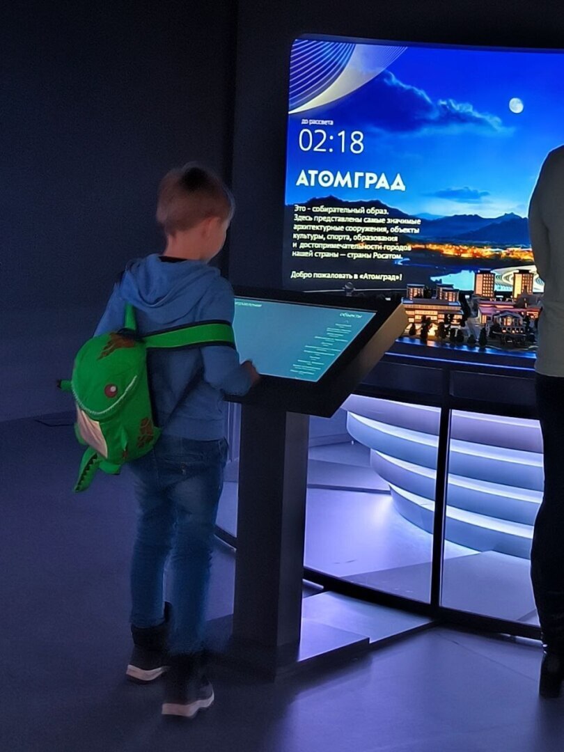 Максима заинтересовал теле стенд, которым можно управлять, нажав на конкретный объект нашей страны. Это собирательный стенд, где представлены самые значимые архитектурные сооружения, объекты образования, культуры, спорта и различные достопримечательности городов России!
