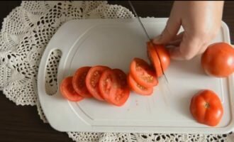 Нарезаем помидоры кружочками. И делаем соус для смазывания наших овощей.