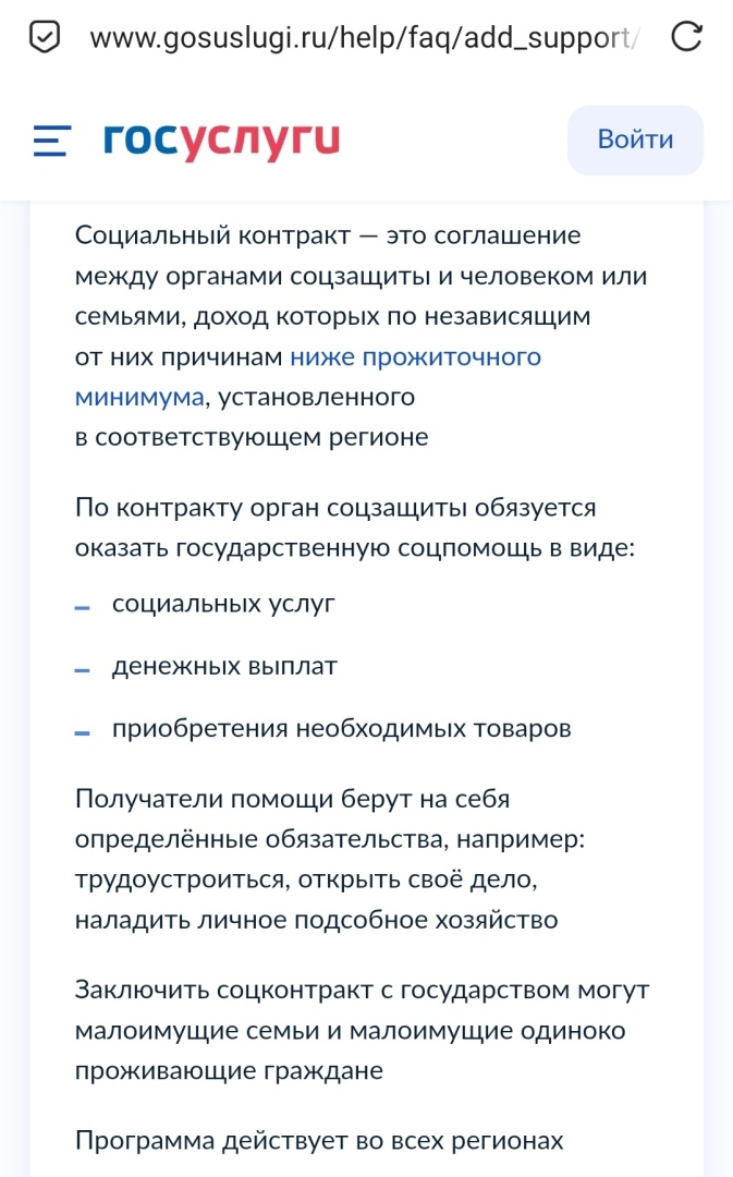 Известно, что на территории Российской Федерации действует такая мера государственной поддержки как социальный контракт. Основная цель поддержки - преодоление семьей трудной жизненной ситуации. Подробнее https://www.gosuslugi.ru/help/faq/add_support/102193 (ссылка в комментарии)