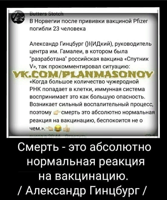 Как Вы думаете, если все люди будут поступать таким же образом, то будут ли они искать виноватых, и пугать других фактами и событиями, которые находятся во внешнем мире и вне их контроля? У каждого из нас свои задачи. Что касается прививок от Ковида, как и любая прививка они имеют свои плюсы и минусы, но смертность от Ковида, как я предполагаю гораздо больше, чем от прививок, не так ли?