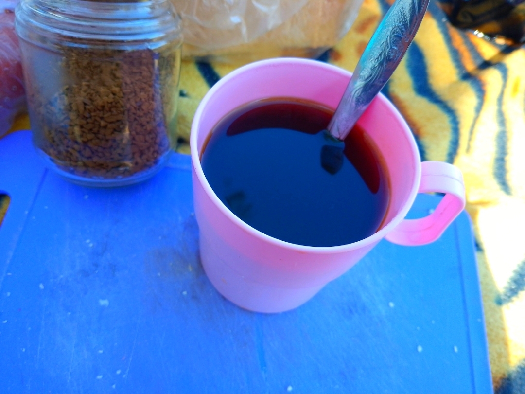 Мы устроили уютный пикник прямо на берегу этой необычной "пустынной" реки. Расстелили пледы на песке, достали еду, нагрели воды на походной плите и сделали себе с мужем кофе, а ребенку чай.