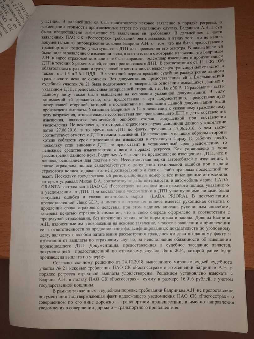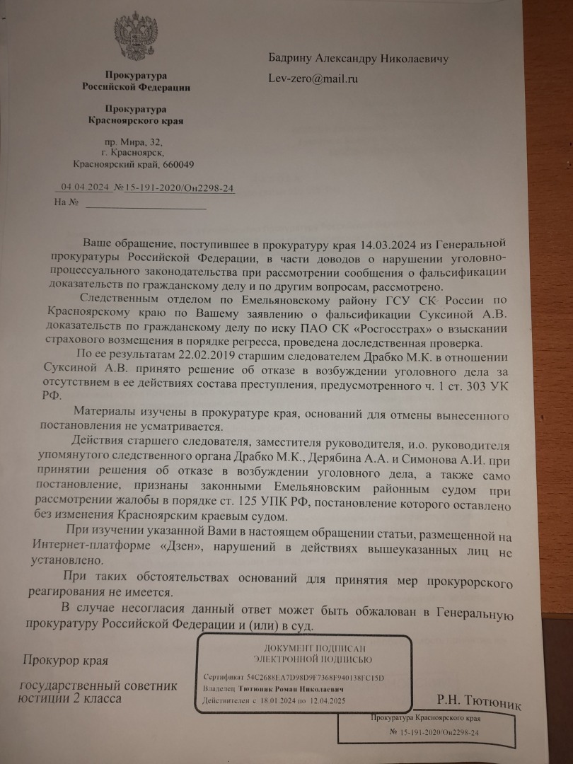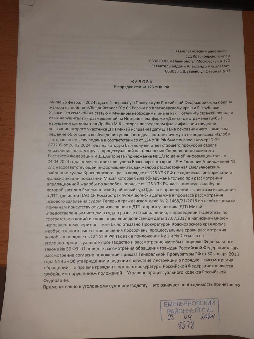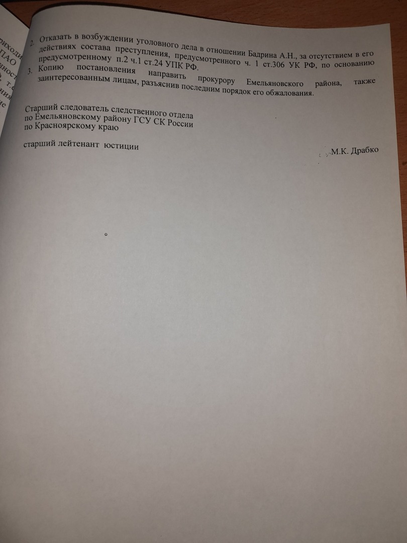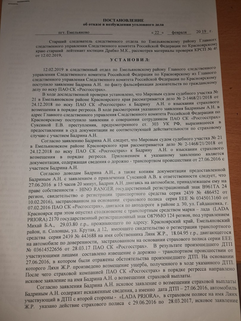ответ все таки пришел.Самое основное- это фальсификация показаний второго участника ДТП Михай следователем СО Емельяновского района Драбко М.К. путем подмены даты