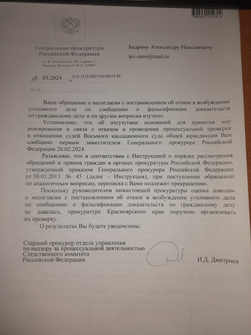 уже дважды и тем более именно в спорной дате должно быть 27.06.2016.И если бы сразу эта "ошибка" выявилась,то исправление и подпись следователя были бы сделаны одними чернилами,а здесь предположительно подпись следователя сделана одними чернилами после ознакомления Михай со своими пояснениями,причем интересно Михай ставит свою подпись без ссылки на то,что пояснения взяты с его слов им прочитаны.Потом кто то ознакомился с данными пояснениями и указал исправить дату с 2 на 1,а вот ручки с такими чернилами уже не было.Теперь смотрим как прокуратура Красноярского края дает ответ