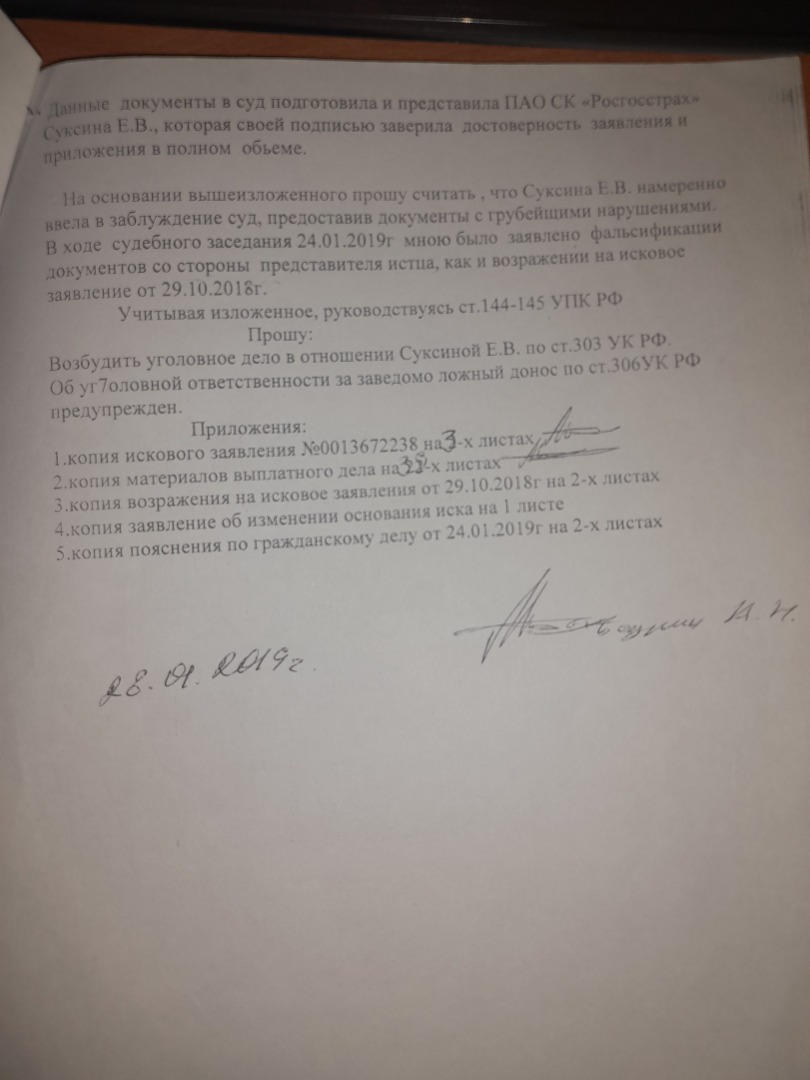 Я просил возбудить уголовное дело в отношении Суксиной,которая при подаче первичного обращения в суд прикладывает копию извещения о ДТП вот такого плана