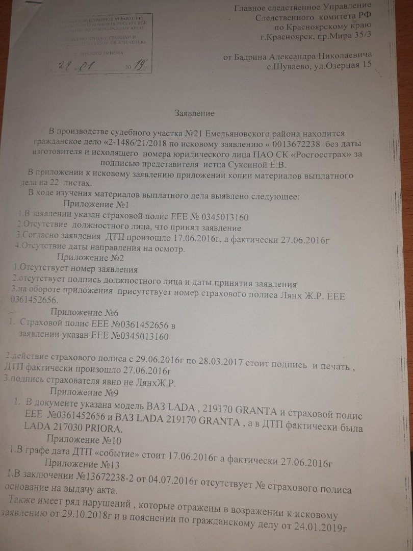 самое интересное когда я его подавал лично сотрудник ГСУ СК России по Красноярскому краю и РХ меня сразу огорошил - почему Вы считаете,что здесь присутствует вина Суксиной? Ее вины в этом НЕТ.Так и СДЕЛАЛИ