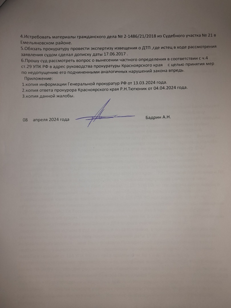 судья Судебного участка № 21 в Емельяновском районе Фром Е.С. - суд первой инстанции пыталась мне доказать,что это я дописал дату,так как подпись стоит моя и я от подписи не отказываюсь.Ну что ж на основании ответа прокурора Красноярского края Тютюник Р.Н. подаем жалобу
