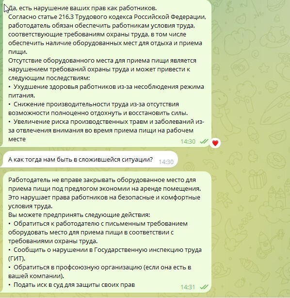 Согласно статье 216.3 Трудового кодекса Российской Федерации, работодатель обязан обеспечить работникам условия труда, соответствующие требованиям охраны труда, в том числе обеспечить наличие оборудованных мест для отдыха и приема пищи.