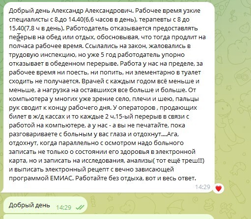 Добрый день, Александр Александрович. Рабочее время: узкие специалисты с 8.00 до 14.40 (6,6 часов в день), терапевты с 8 до 15.40 (7,8 ч в день). Работодатель отказывается предоставлять отдельную комнату для приема пищи. А несколько дней назад отменил перерыв на обед или отдых, обосновывая, что тогда продлит на полчаса рабочее время. Ссылались на закон, жаловались в трудовую инспекцию, но работодатель упорно отказывает в обеденном перерыве. Работа у нас на пределе, за рабочее время ни поесть, ни попить, ни элементарно в туалет сходить не получается. Врачей с каждым годом всё меньше и меньше, а нагрузка на оставшихся все больше и больше. От компьютера у многих уже зрение село, плечи и шею, пальцы рук сводит к концу рабочего дня. У операторов ,продающих билет в ж/д кассах, и то каждые 2 часа15-минутный перерыв в связи с работой на компьютере, а у нас – а вы не печатайте, пока разговариваете с больным, у вас глаза и отдохнут... Ага, отдохнут, когда параллельно с осмотром надо записать не только о состоянии его здоровья в электронную карту, но и записать на исследования, анализы (тот ещё треш!!!) и выписать электронный рецепт с вечно зависающей программой ЕМИАС. Работайте без отдыха – вот и весь ответ.