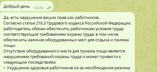 Добрый день, гости и пользователи сайта! Ко мне обратилась заявительница с просьбой помочь ей разобраться в интересном вопросе, обязан ли работодатель предоставлять место для приема пищи, если рядом нет столовой.